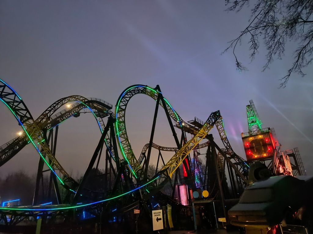 As soon as the sun went down, it was time for what we had come for: the Bright Nights, rides and lights. The trails are already lit up during the day, but after 16:30, the lights on the attractions come on, creating an even better atmosphere in the park. Keep in mind that some attractions will remain closed after sunset, at the entrance of each attraction it is mentioned until what time it is open. The various roller coasters and attractions got their own light show, and the illuminated themed areas looked a lot better in the dark. Call me crazy, but with Mariah Carey in the background and a cool light show, you can’t skip the Condor. It is not a popular rollercoaster among theme park fans, but this is an experience not to be missed.