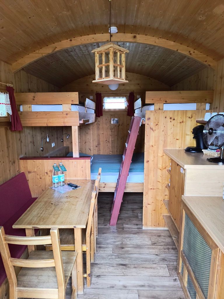 I have never slept in a shepherds wagon before, let alone seeing one ever in person, so I was very surprised when I opened the door. It was a fairly spacious room, with bunk beds on either side and a large bed for adults underneath. The beds are not a standard size (except for the bunk beds), don’t worry if you’re a tall guy (or girl) you will have a good night sleep here without your feet sticking out of the bedframe. Since I never slept in a shepherds wagon I opted for the full experience and slept in one of the bunk beds. And it didn’t disappoint!